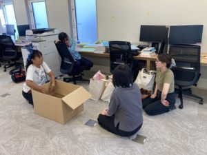 段ボールを抱えて旧社屋と新社屋を行き来し、机や書類、サンプル品まで…一つひとつ手作業で移動。