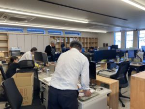 完成したばかりの新社屋に荷物を運び込む作業は、社員全員で行いました。
